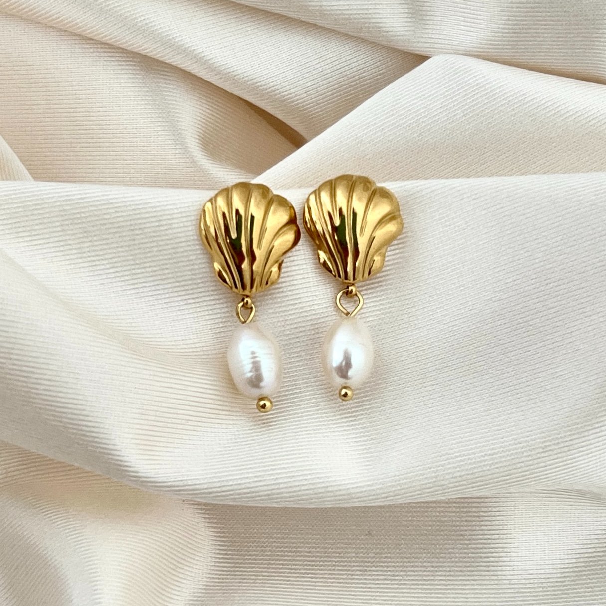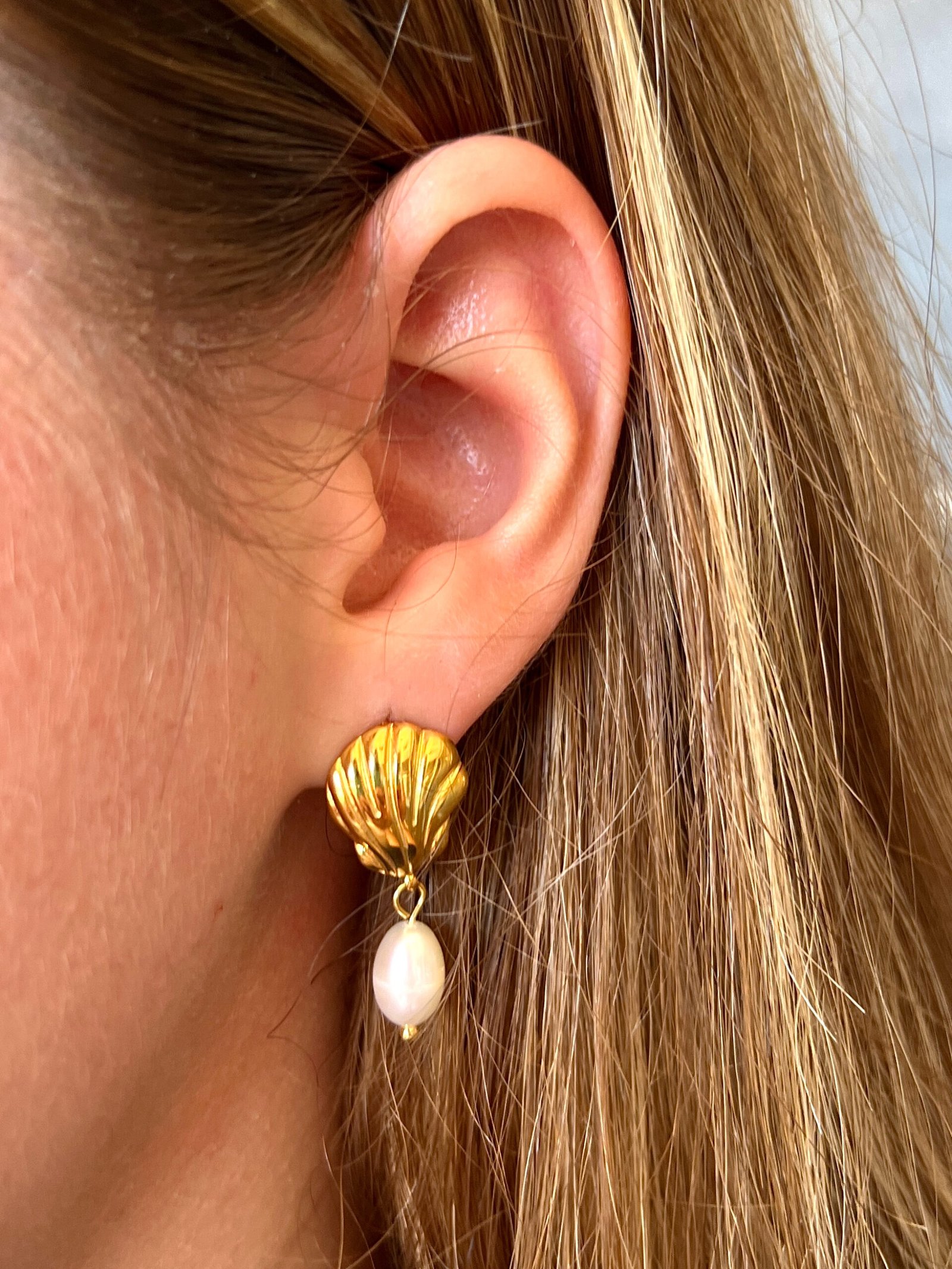 עגילים אלגנטיים ומעודנים בהשראת הטבע, הכוללים אלמנט של צדפה מוזהבת ממנה משתלשלת פנינה קלאסית.