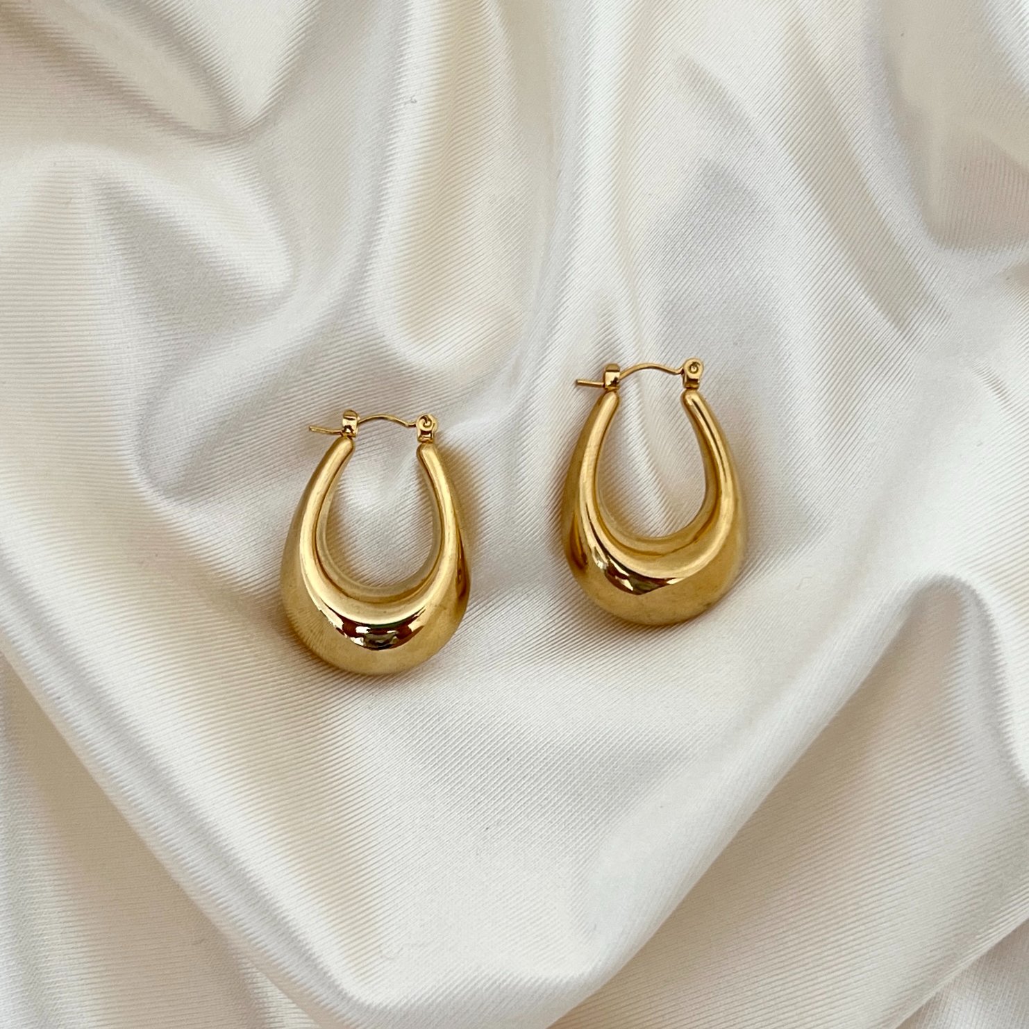 עגילים במראה זורם ואלגנטי, בעיצוב המזכיר חצי ירח או טיפה עדינה. הברק המוזהב שלהם מעניק תחושת יוקרה ורוך, ומתאים להשלמת כל לוק – בין אם ליום יום ובין אם לאירוע מיוחד. עיצובם הייחודי מוסיף תנועה עדינה ונוכחות לכל הופעה, מה שהופך אותם לתכשיט על-זמני ואלגנטי