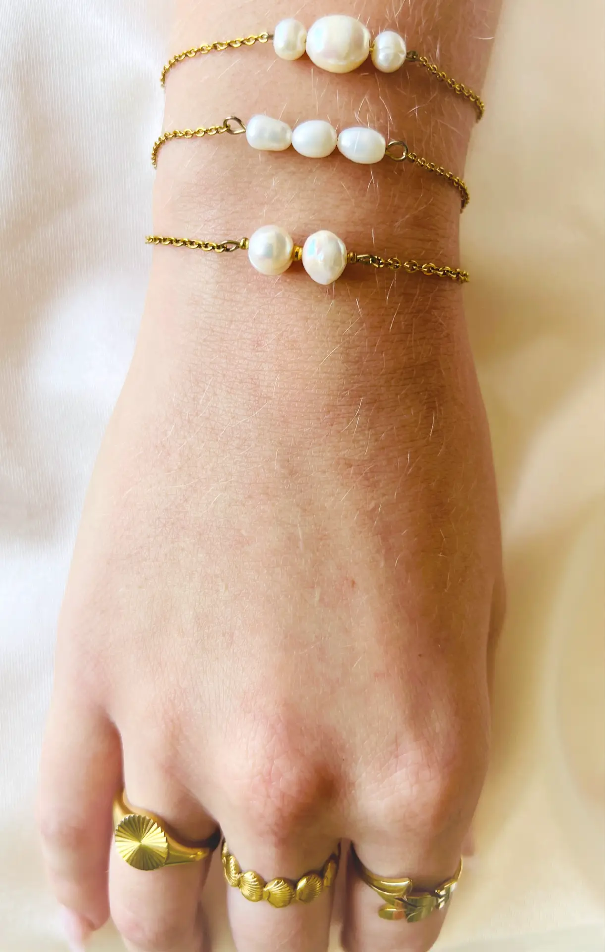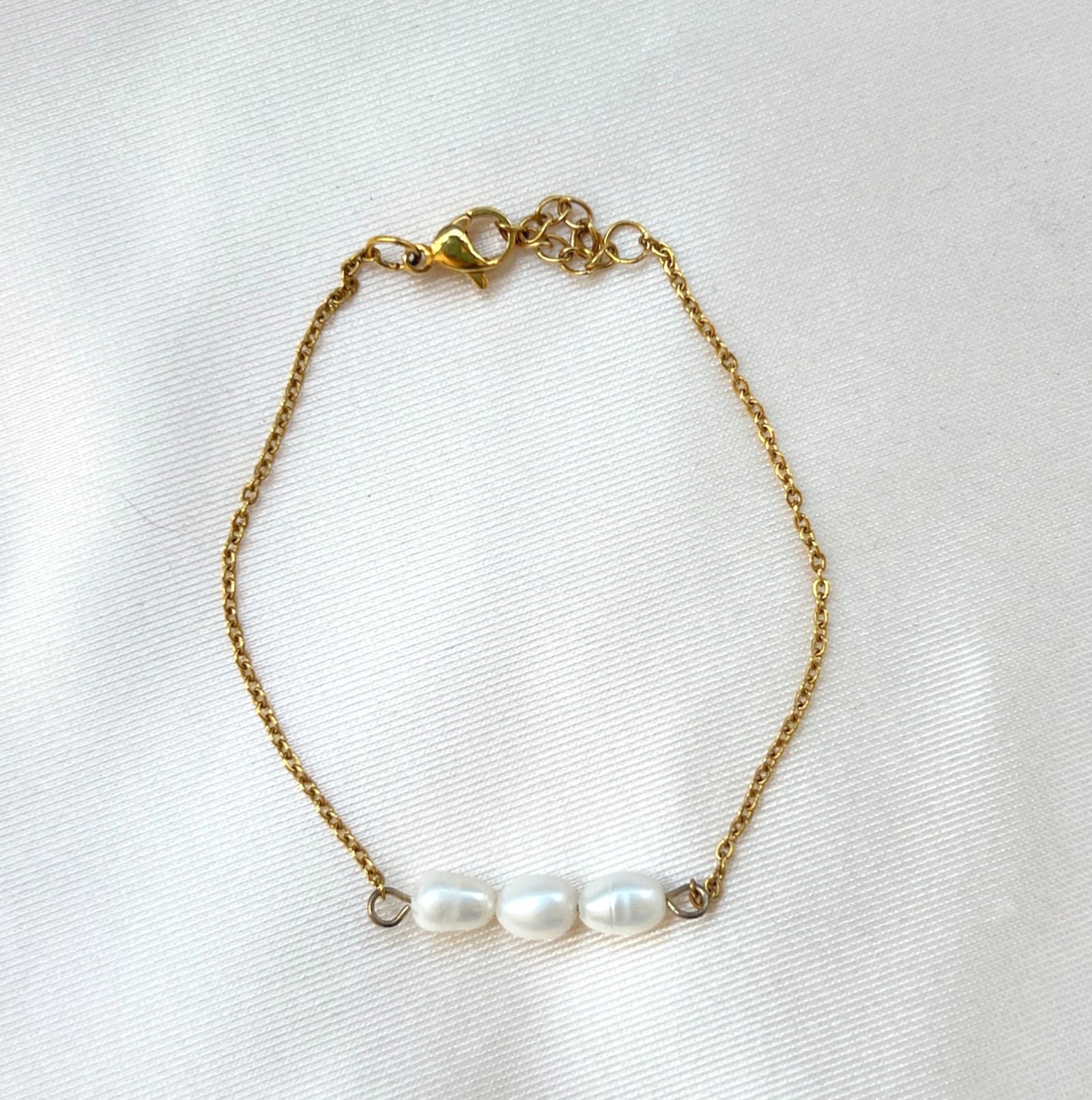צמיד פנינה עדין המוקדש ליופי ולאלגנטיות. הצמיד עשוי משרשרת זהובה, המעוטרת בשלוש פנינים מבריקות, המוסיפות נגיעה של רוך ותחכום. הגימור המבריק של הזהב משלים את המראה הכללי, והפנינים יוצרות ניגוד מושלם עם הצבע של המתכת, מה שמקנה לצמיד מראה יוקרתי ונעים לעין.