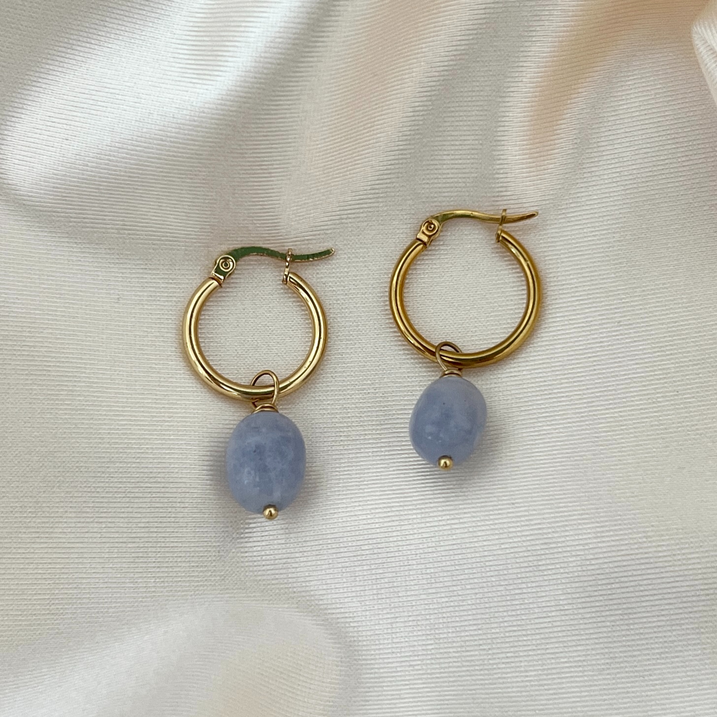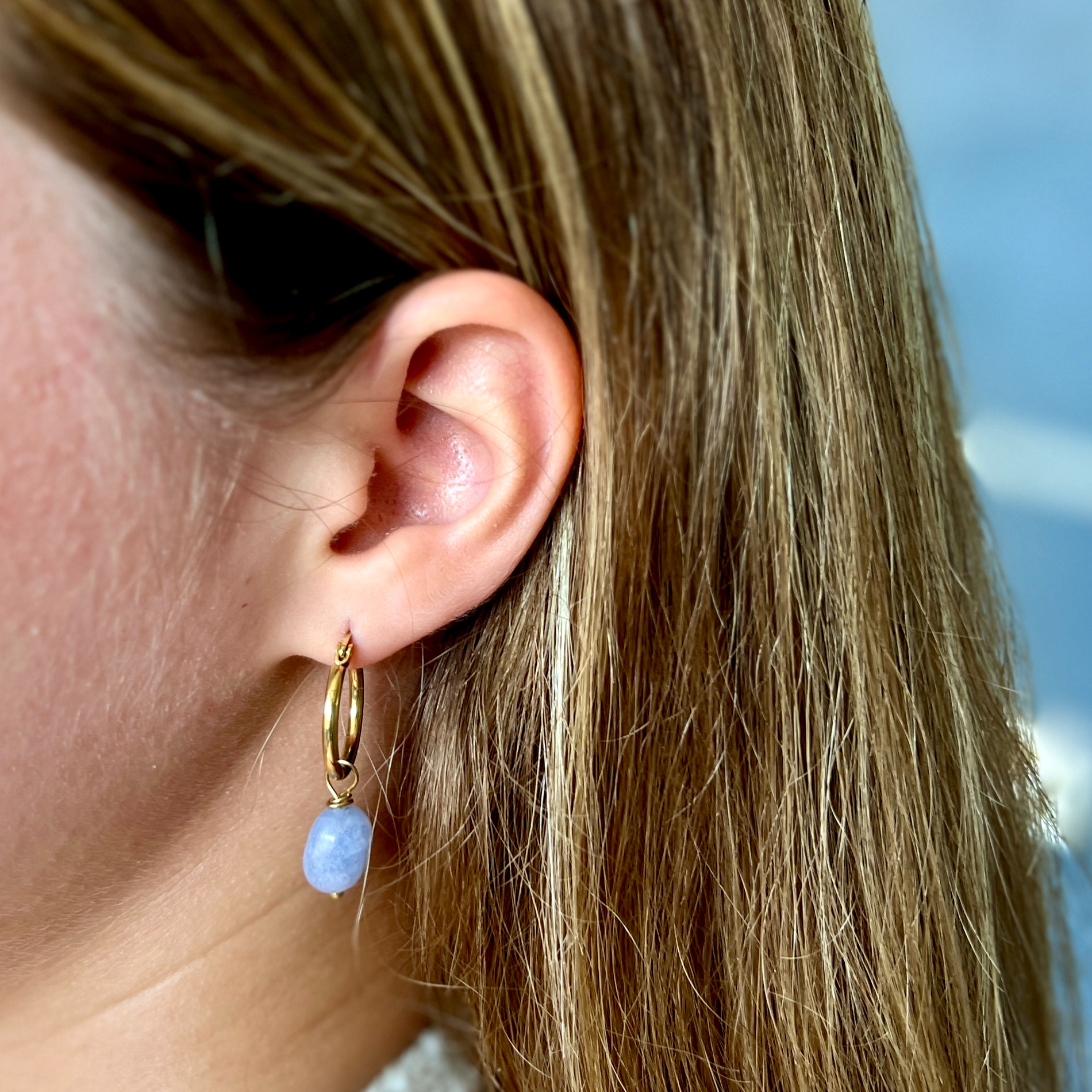 עגילי חישוק עדינים המשובצים בתליונים של אבן קלצדון בגוון תכלת מעודן. אבן הקלצדון ידועה בתכונותיה המרגיעות, המזמינות רוגע ואיזון פנימי. תליון האבן משתלשל מהחישוק בצורה רכה ומעודנת, ומעניק לעגילים נוכחות רגועה ואצילית. העיצוב המינימליסטי והגוונים הקרירים יוצרים תחושה של קלילות ונינוחות, מה שהופך את העגילים לבחירה מושלמת גם לאירועים מיוחדים וגם ליום-יום.