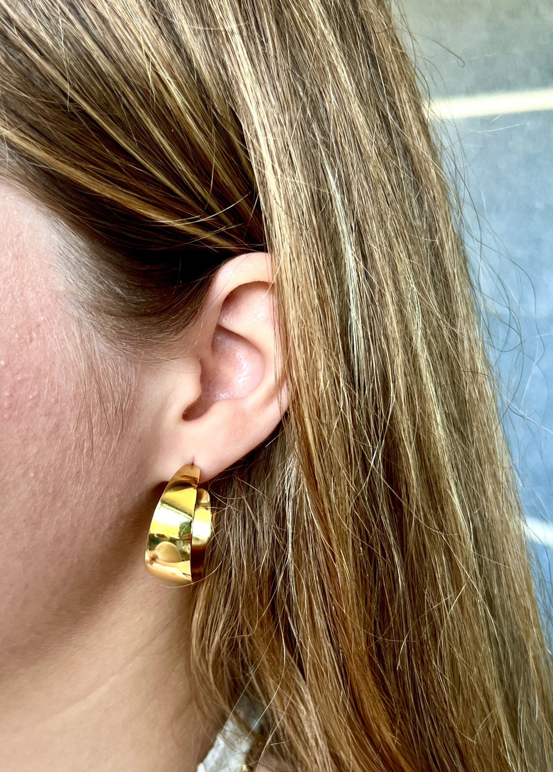 עגילי חישוק רחבים בעיצוב ייחודי עם לולאה מעוקלת במרכזה, המשדרים יוקרה מודרנית. עיצוב המבריק וגימור החלק יוצרים מראה אלגנטי-מינימליסטי, המושך תשומת לב ברמיזה. עגילים אלו משתלבים היטב במראה יום-יומי ויוסיפו נגיעה של סטייל לערב מיוחד.