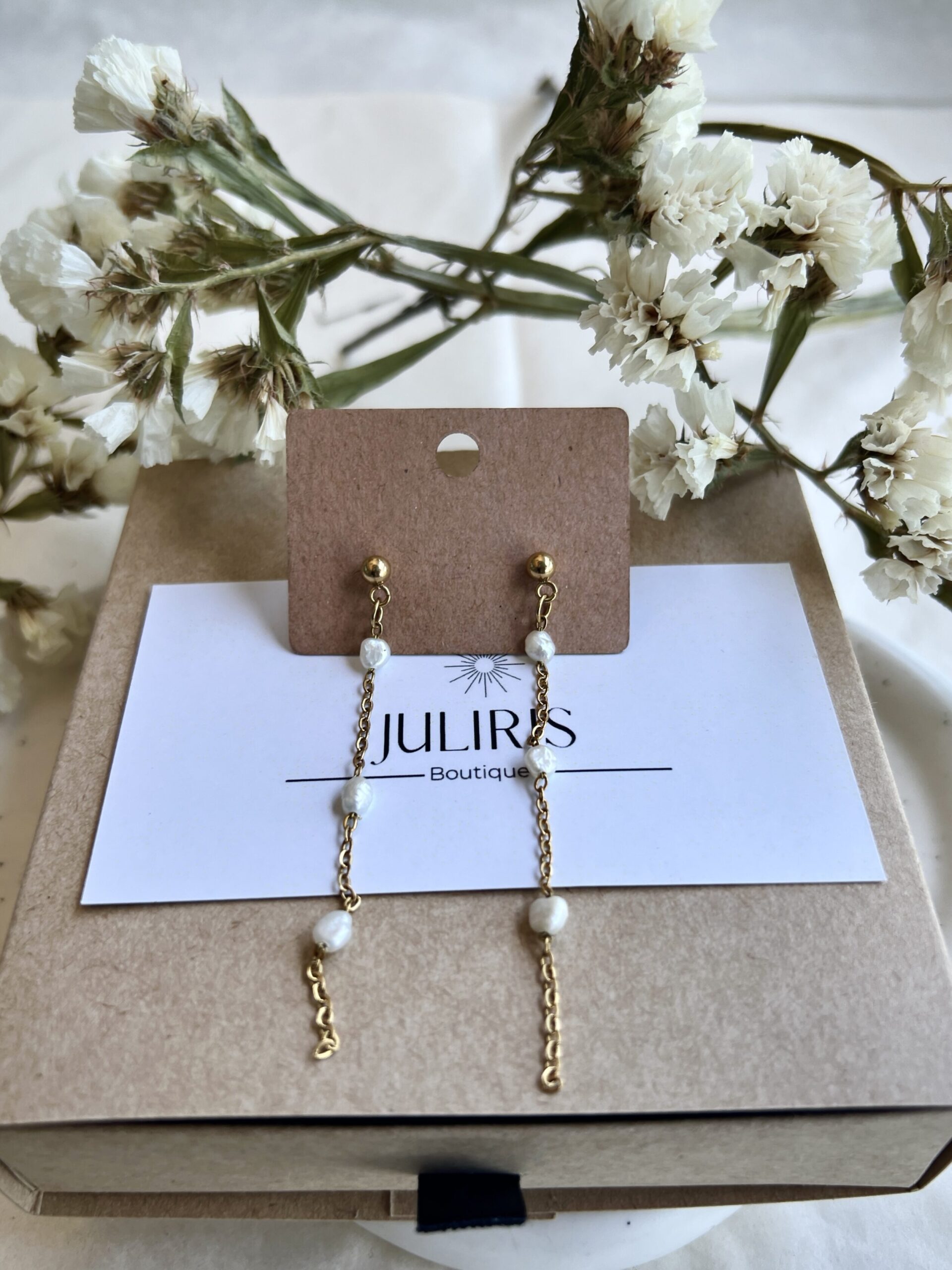 עגילים ארוכים בעיצוב אלגנטי ומשתלשל, המשלבים פנינים עדינות השזורות בשרשראות מוזהבות, המקנות תנועה רכה וזורמת לכל תנועה. העגילים יוצרים מראה אלגנטי ומוקפד, מושלם להשלמת הופעה יומיומית קלאסית או לערב חגיגי.