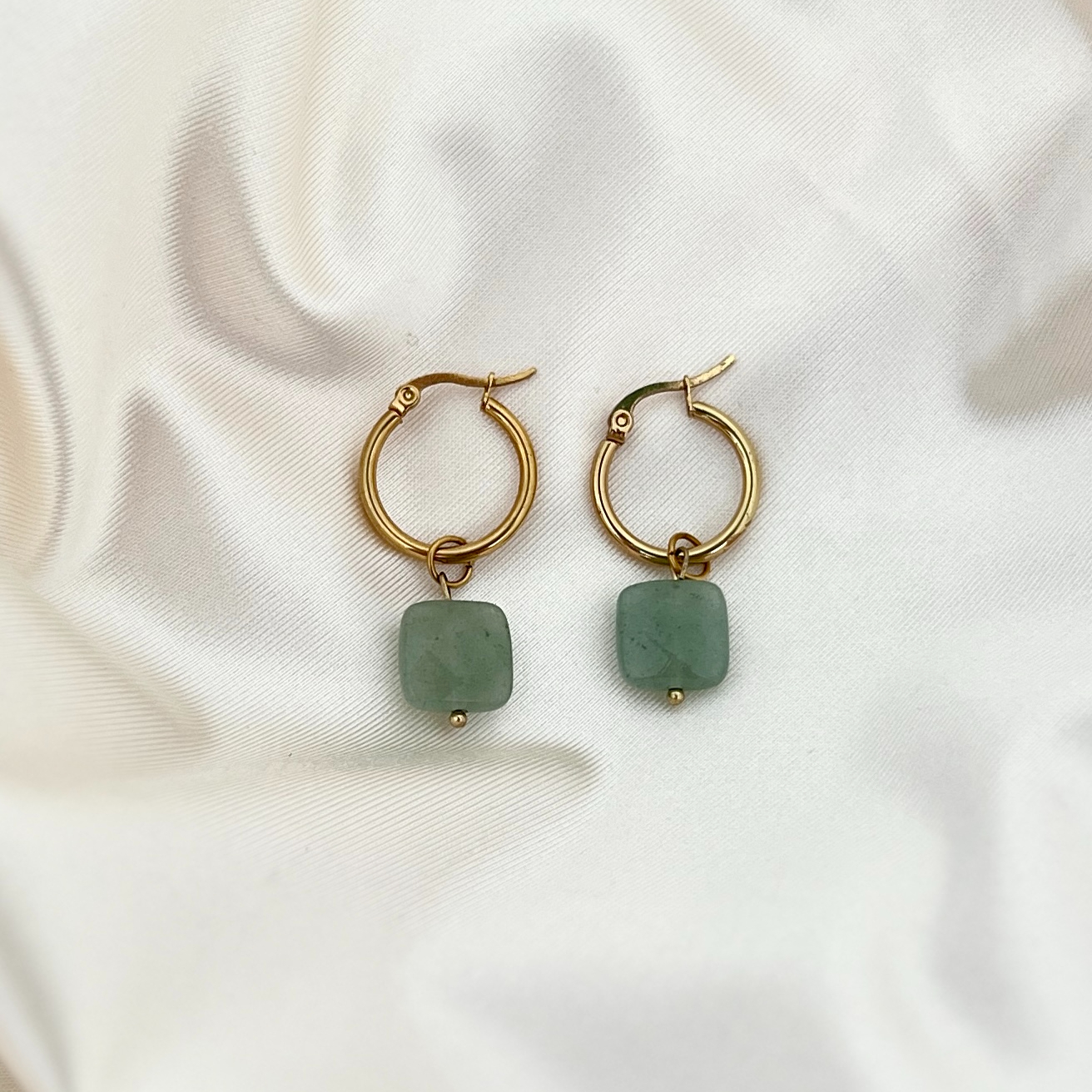 עגילי חישוק קלאסיים המעוטרים בתליון אבן ירקרקה ריבועית, המוסיפה נופך טבעי ונקי. האבן מביאה עמה תחושת רוגע ועדינות, ומשתלבת בצורה מושלמת עם זהב החישוק למראה מאוזן ואלגנטי. העיצוב המאפשר התאמה מושלמת לכל סגנון לבוש – מיום עבודה ועד לערב יוקרתי.