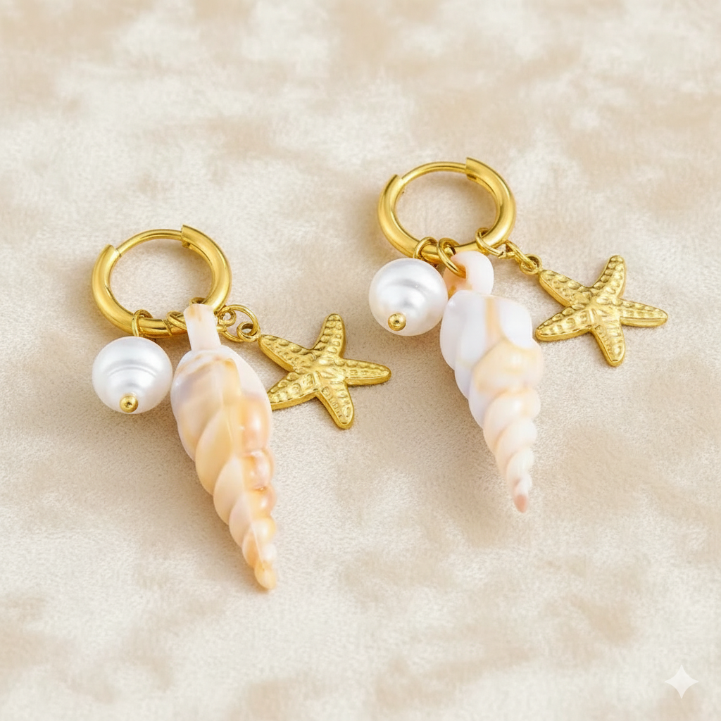 עגילי Magic – ים, יוקרה וקסם בכל הופעה. עגילים ייחודיים בעיצוב של צדף ופנינה מחוברים עם תליון כוכב ים עדין. כל זוג עוצב בהשראת הקסם של הטבע והגלים ומיוצר בקפידה מחומרים איכותיים לעמידות ולנוכחות בולטת. שילוב זהב, פנינה וצדף הופך את עגילי Magic לפריט מושלם לכל אישה שאוהבת להרגיש מיוחדת ומלאת סטייל.